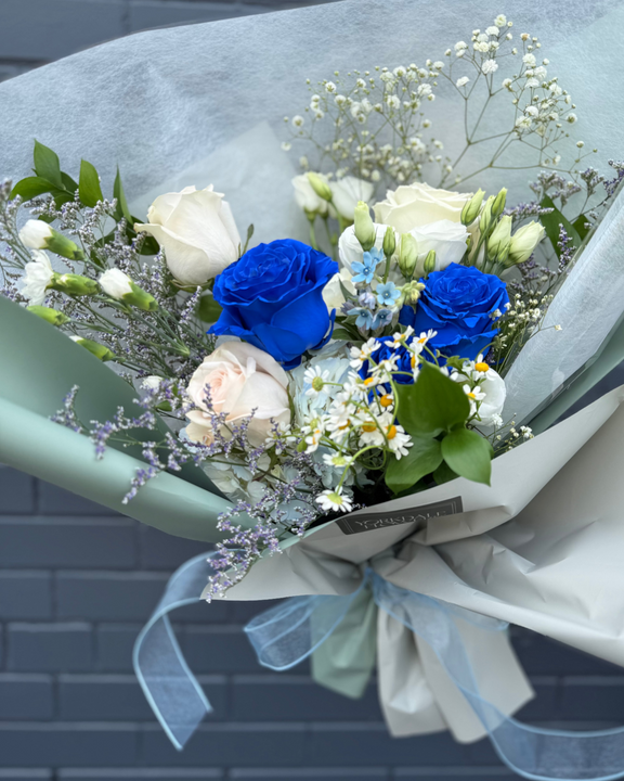Blue & Bloom brings together striking royal blue roses with crisp white flowers for a bold, eye-catching mix that’s equal parts cool and elegant.