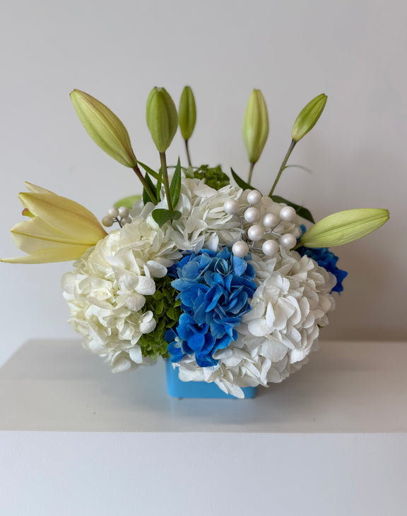 Blue Haven captures a luxurious sense of calm, balancing rich blue tones with pure white accents for an arrangement that feels both indulgent and soothing.