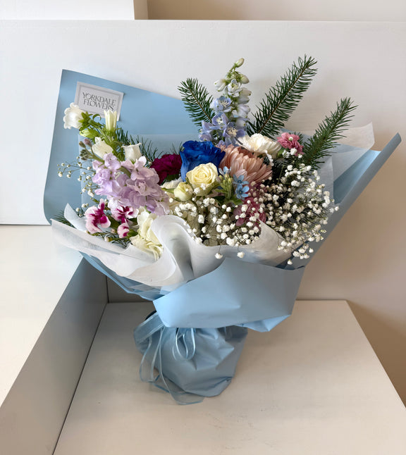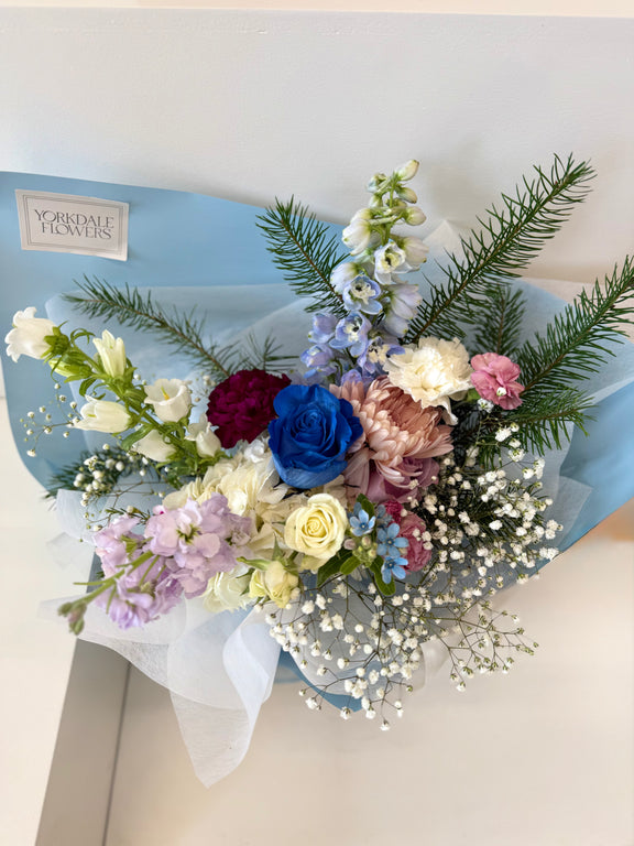 Bluebird Bliss blends serene blue roses with delicate pastel accents, creating a romantic, soft-hued bouquet ideal for anniversaries, birthdays, or any moment worth celebrating.