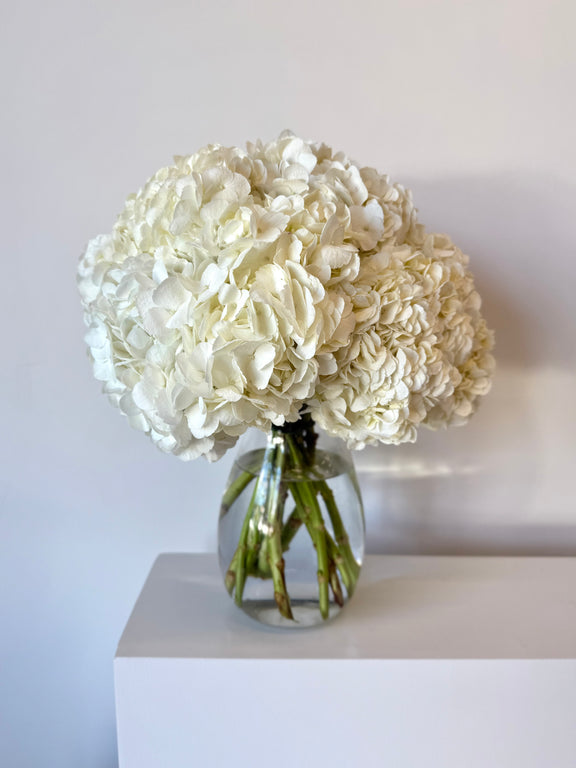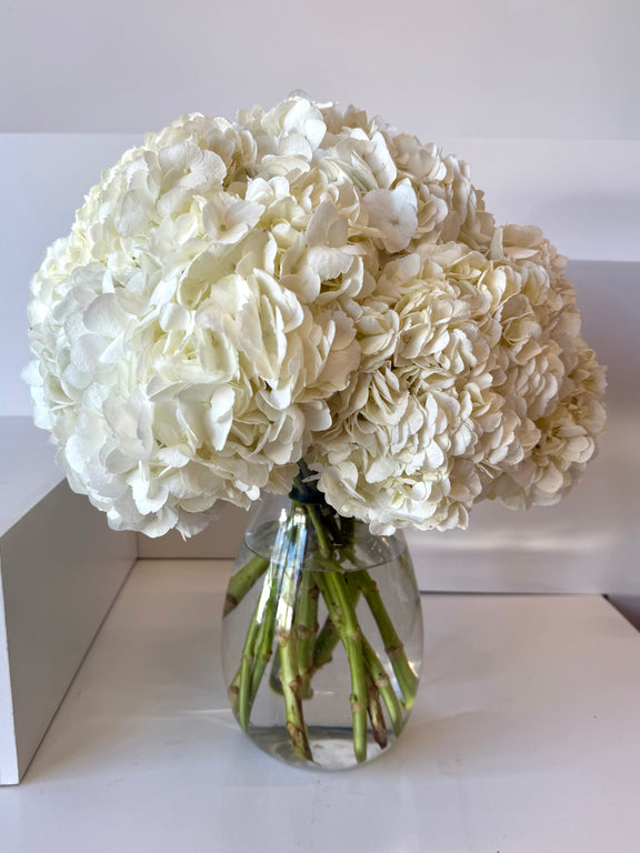 features lush white hydrangeas arranged in a sleek clear glass vase, creating a luxurious and timeless display that complements any elegant interior.