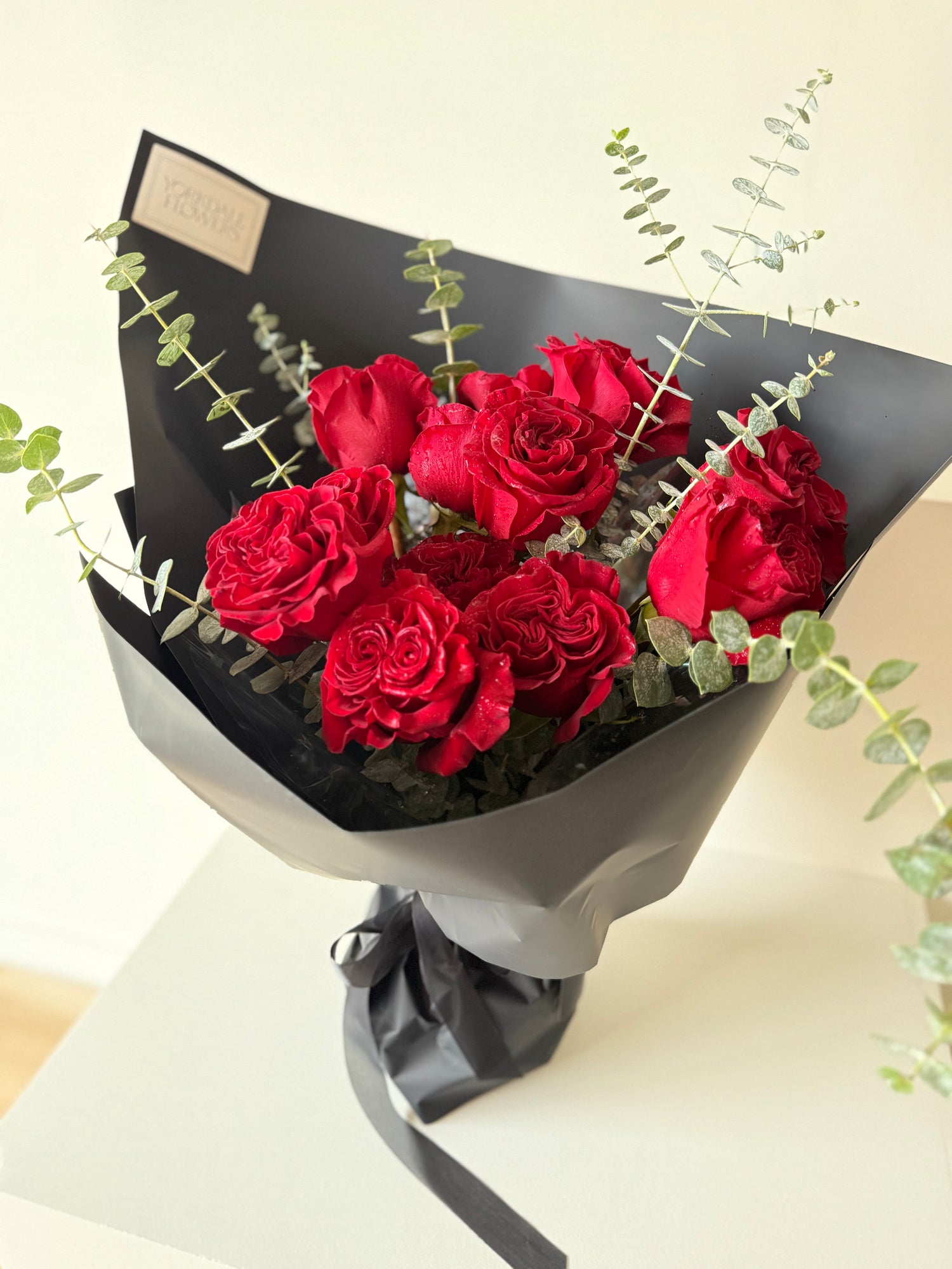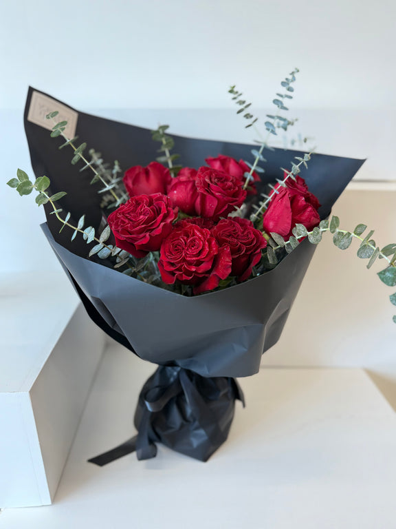 Deep red garden roses gathered in a luxurious bouquet, exuding timeless beauty and sophistication.