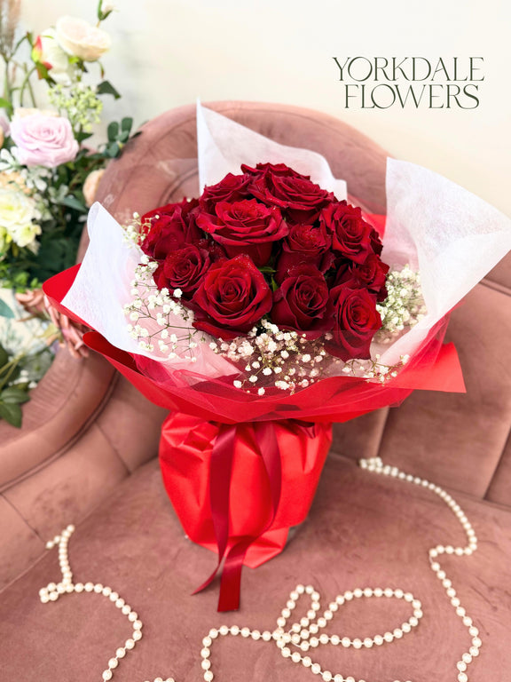 A round-style bouquet of premium red roses, arranged to create a full, harmonious bloom.