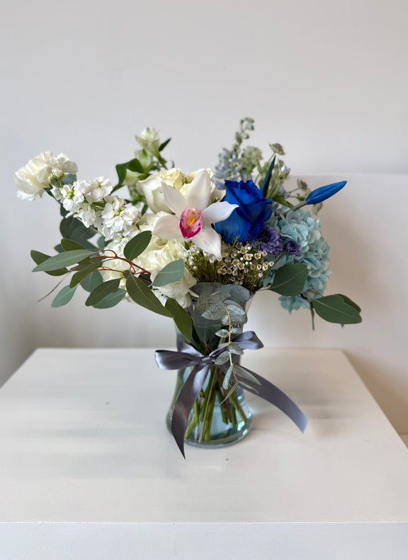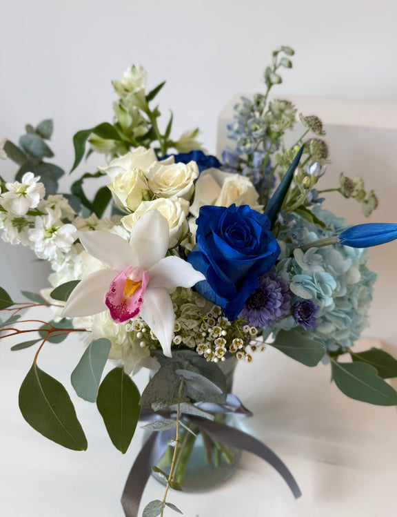 Indigo Grace pairs rich dark blues with crisp whites for a polished, elegant bouquet. Perfect for special occasions or as a luxurious gift with lasting impact.