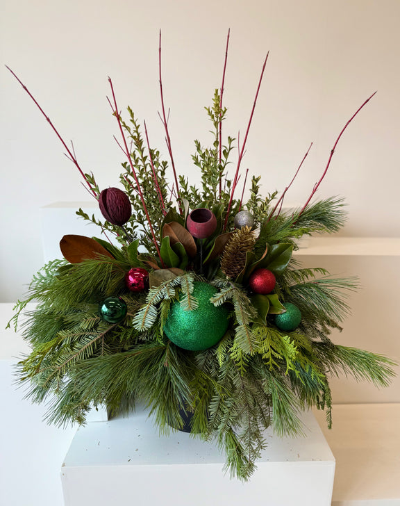 Wintergreen Magnolia brings together the fresh beauty of wintergreens with the timeless charm of magnolia leaves. A lush, seasonal planter that adds natural warmth and elegance to any porch or entryway.