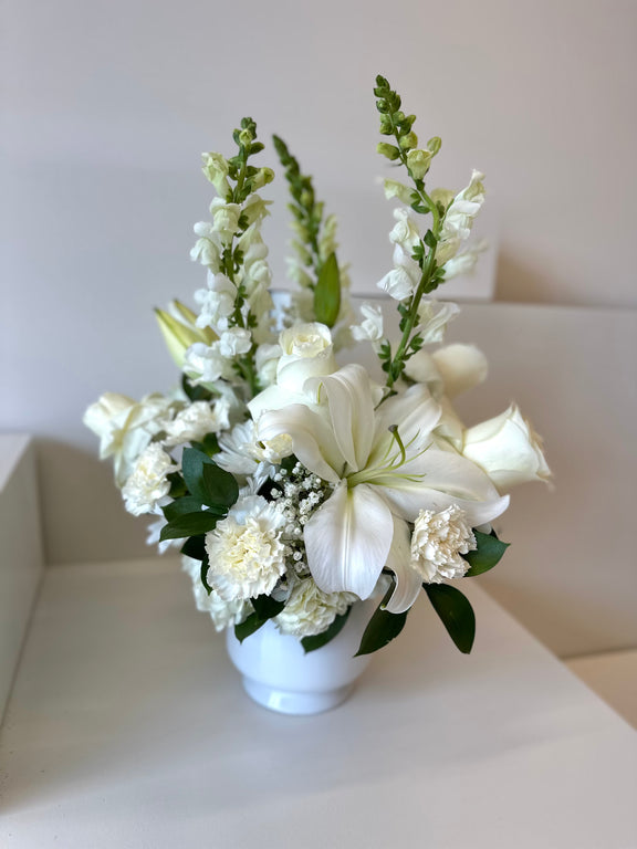 Crisp white blooms balanced with lush greenery for a look that’s calm, elegant, and refreshing.