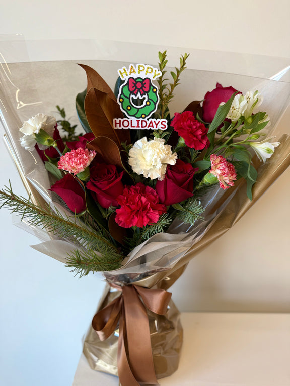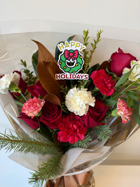 Season's Bloom blends crisp whites, vibrant reds, and magnolia with fragrant wintergreens for a joyful, eye-catching bouquet perfect for gifting or decorating.