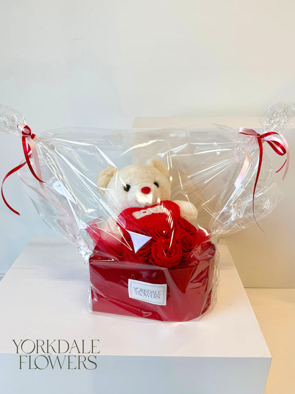 A sophisticated heart box of preserved roses paired with a plush bear, blending elegance and charm.