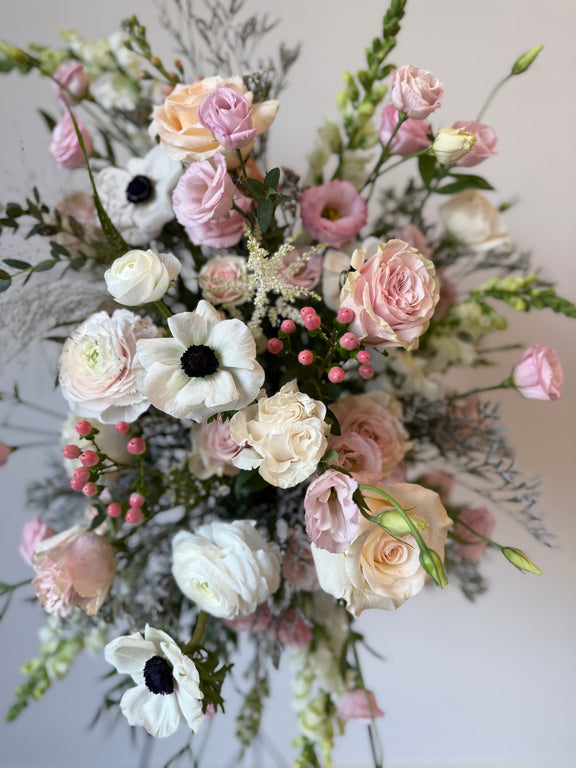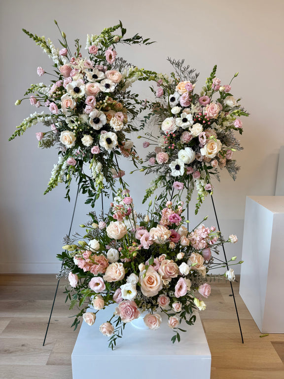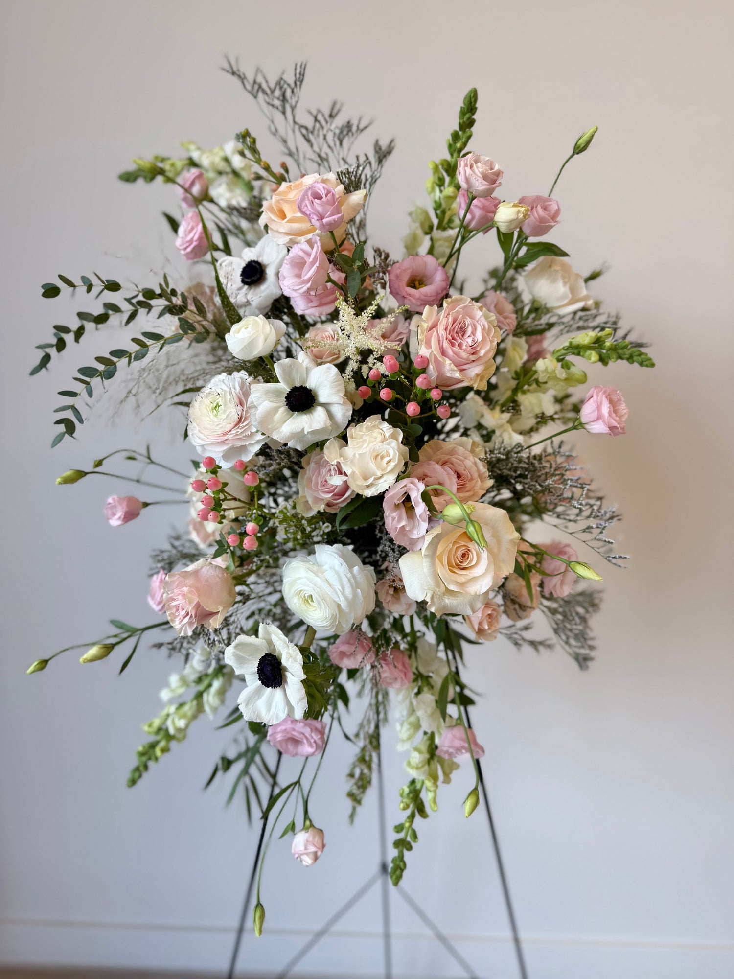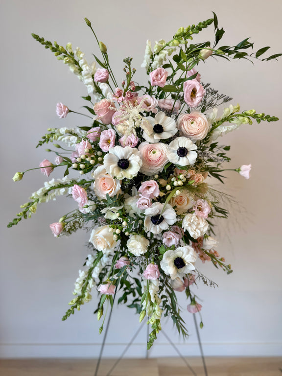 Blush pink blossoms and white florals woven together to express sympathy with warmth and compassion.