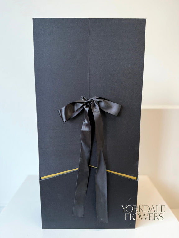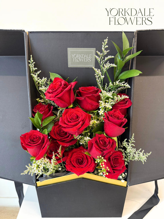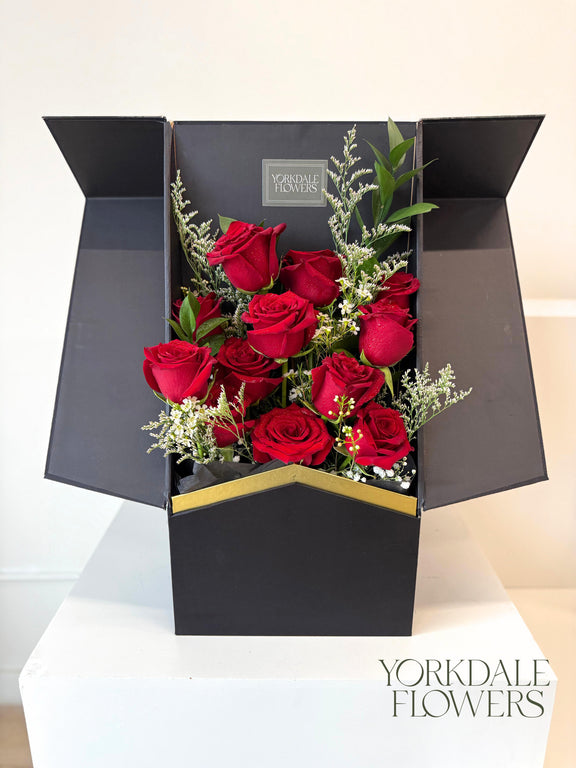 A lush garden of one dozen premium red roses, artfully arranged in a luxurious black presentation box.